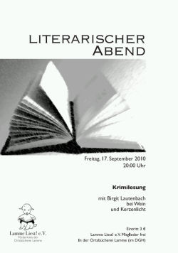 Am Freitag, den 17. September findet um 20.00 Uhr eine Autorenlesung mit Birgit Lautenbach in der Ortsbücherei Lamme (Dorfgemeinschaftshaus), Frankenstraße 29, statt. Der Förderkreis Lamme Liest! e.V. lädt herzlich zu diesem spannenden Krimiabend bei Wein und Kerzenlicht ein.